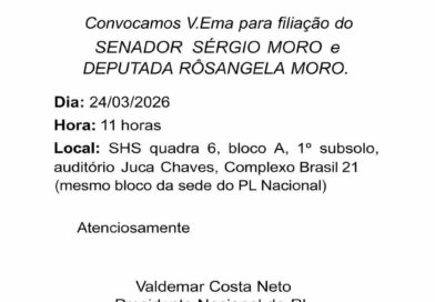O Partido Liberal (PL) realizará, no dia 24 de março de 2026, em Brasília, evento oficial para a filiação do
