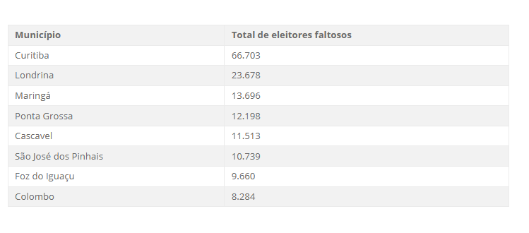 Quem não compareceu às urnas nos últimos três turnos, não justificou e não pagou multas têm até o dia 19 de maio para regularizar a situação e evitar que o seu Título de Eleitor seja cancelado. No Paraná, há 356.605 eleitores faltosos, de acordo com o portal de estatísticas do Tribunal Superior Eleitoral (TSE). Confira os municípios com mais casos: